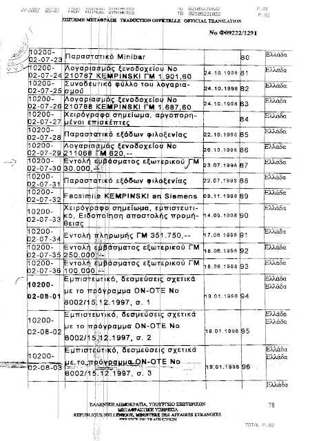 Το αποκλειστικό έγγραφο που δημοσιεύει η “Αυγή” της Κυριακής είναι η επίσημη μετάφραση από την Μεταφραστική Υπηρεσία του Υπουργείου Εξωτερικών ενός τραπεζικού extre – ενός από τα εκατοντάδες που βρίσκονται στη δικογραφία και ο εισαγγελέας και οι ανακριτές ζήτησαν να μεταφραστούν. Σύμφωνα με αυτό το extre, στις 23 Ιουλίου 1998 πληρωνόταν ο καθηγ. Δρ. Ιωάννης Καρακώστας με 30.000 γερμανικά μάρκα στην τράπεζα Schmidt Bank στο Μόναχο (αρ. λογαριασμού 066049188). Πρόκειται για επίσημο έγγραφο της δικογραφίας. Δείχνει ακόμη ότι τα 30.000 μάρκα εμβάσθηκαν από το παραλογιστήριο της Siemens, από λογαριασμό που η μητρική τροφοδοτούσε από το Μόναχο (Deutsche Bank) στο Σάλτσμπουργκ και στη Raiffeisenverband.