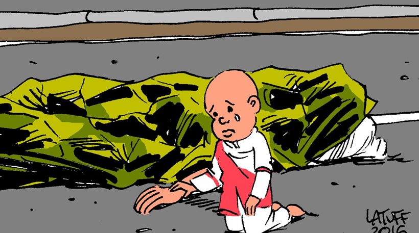 Η φωτογραφία που απεικόνιζε ένα νεκρό κοριτσάκι με την κούκλα δίπλα του φαίνεται πως άγγιξε τον γνωστό σκιτσογράφο, ο οποίος ανέβασε στο Twitter ένα σκίτσο με ένα γονατιστό παιδάκι να πιάνει το χέρι ενός από τα θύματα που είναι σκεπασμένο, ενώ ένα δάκρυ κυλάει στο πρόσωπό του…