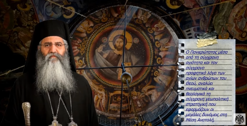 Ο Πανιερώτατος μέσα από τη σύγχρονη αγιότητα και τον σύγχρονο προφητικό λόγο των αγίων ανθρώπων του Θεού, αναλύει πνευματικά και θεολογικά τη σύγχρονη γεωπολιτική στρατηγική που εφαρμόζουν οι μεγάλες δυνάμεις στη Μέση Ανατολή, η οποία είναι μέρος των ευρύτερων υποχθόνιων σχεδίων των ανθρώπων του μυστικού χρήματος, της νέας τάξης πραγμάτων, που έχουν σαν στόχο τη δημιουργία του φθαρμένου ανθρώπου που δεν θα έχει καμία ηθική αντίσταση…