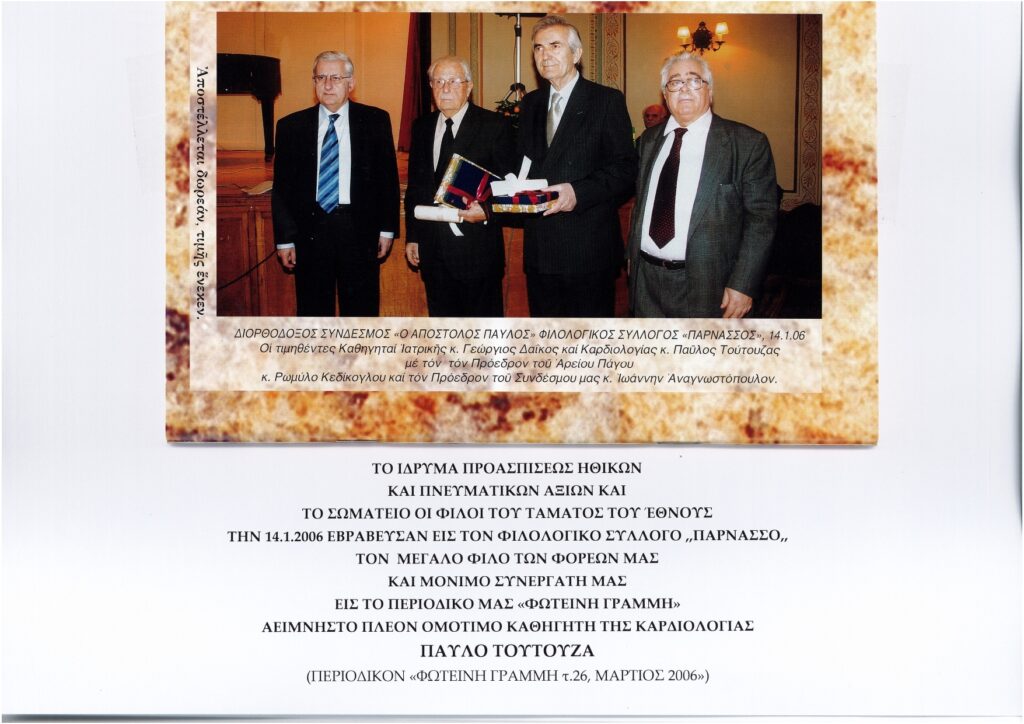 Τὸ Ἵδρυμα Προασπίσεως Ἠθικῶν καὶ Πνευματικῶν Ἀξιῶν καὶ Οἱ Φίλοι τοῦ Τάματος τοῦ Ἔθνους τὴν 14.1.2006 ἐβράβευσαν εἰς τὸν Φιλολογικὸν Σύλλογον «Παρνασσός» τὸν μεγάλο φίλον τῶν φορέων μας, ἀείμνηστον πλέον ὁμότιμον Καθηγητὴν τῆς Καρδιολογίας ΠΑΥΛΟΝ ΤΟΥΤΟΥΖΑΝ (+ 26.11.2021).