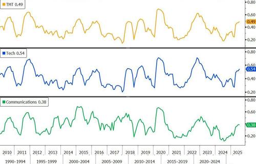 Οι συσχετίσεις ανά μετοχή στους υποκλάδους της τεχνολογίας και των τηλεπικοινωνιών βρίσκονται επίσης πάνω από τους ιστορικούς μέσους όρους – στο 0,54 και 0,38 αντίστοιχα – και συνεχίζουν την ανοδική πορεία τους από τα χαμηλά του 2024.