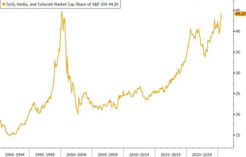 Συγκεκριμένα, ο κλάδος κατέχει το 44,2% της συνολικής κεφαλαιοποίησης του δείκτη – ξεπερνώντας το μετα-πανδημικό υψηλό του 42,8% του Ιουνίου 2024 και πλησιάζοντας το ιστορικό ρεκόρ 44,7% του Φεβρουαρίου 2000.