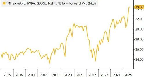 Ίσως το πιο εντυπωσιακό στοιχείο είναι ότι η αποτίμηση του TMT φαίνεται ακόμη πιο υπερβολική αν αφαιρεθούν οι μετοχές των Apple, Microsoft, Nvidia, Alphabet και Meta.